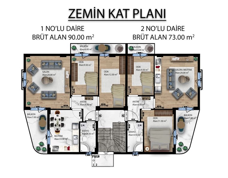 • 2+1 planlı, 90 m² brüt kullanım alanı