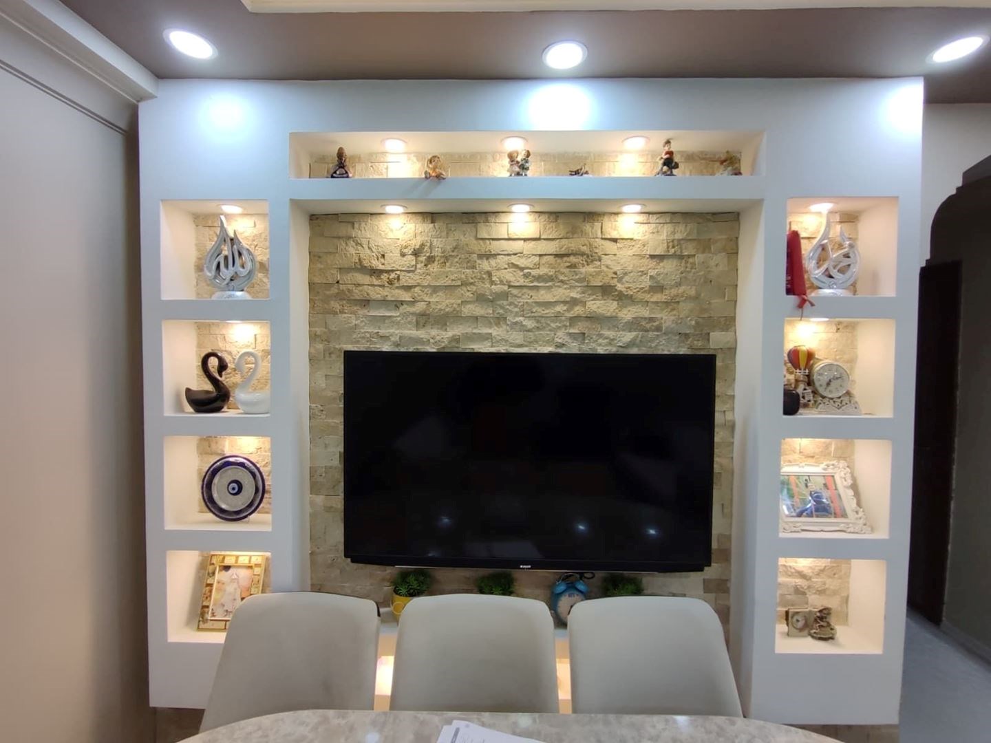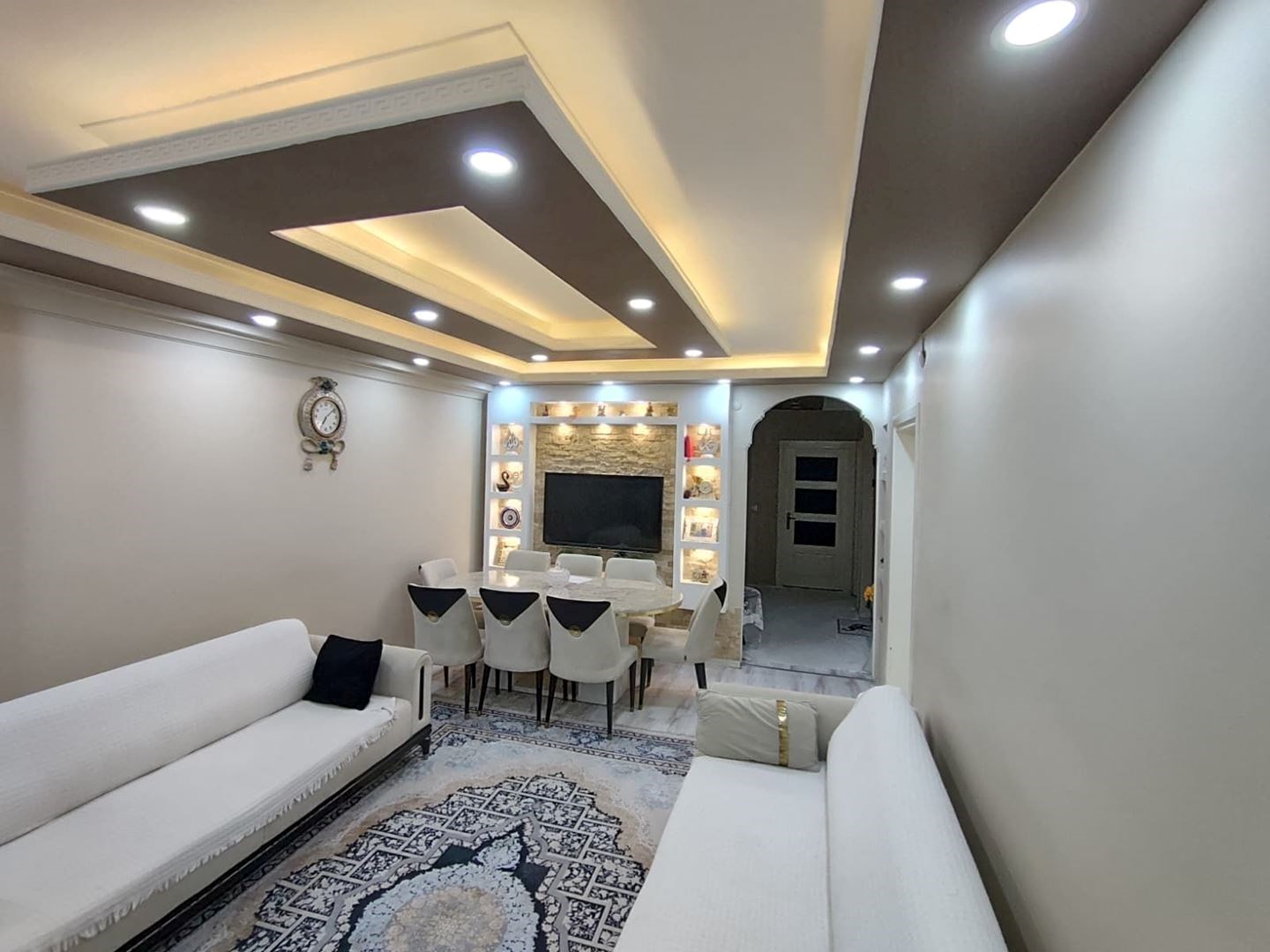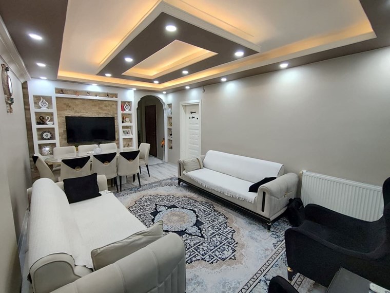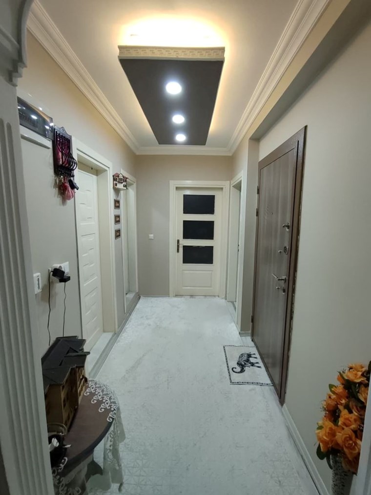 İç mekânda salon ve antrede asma tavan spot + LED aydınlatma, ayrıca duvara sabit modern alçıpan TV ünitesi bulunmaktadır.