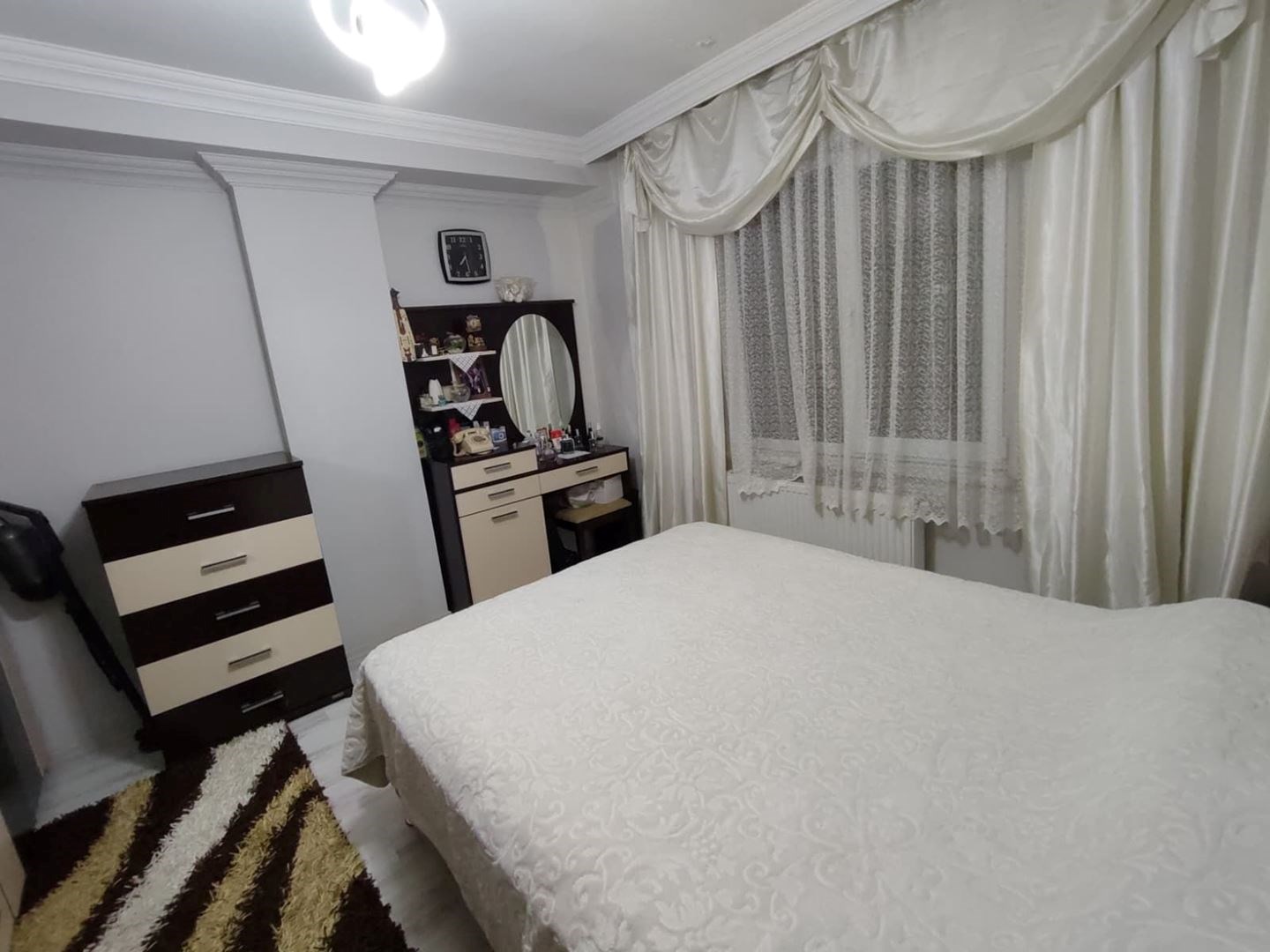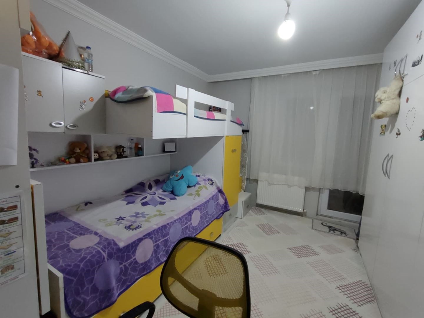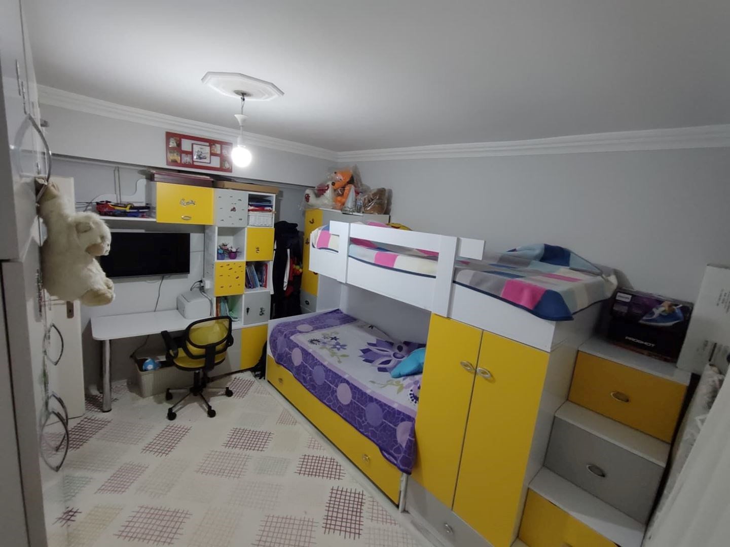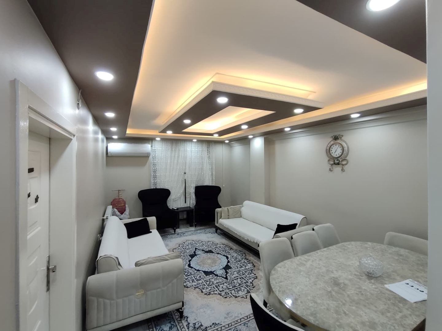İç mekânda salon ve antrede asma tavan spot + LED aydınlatma, ayrıca duvara sabit modern alçıpan TV ünitesi bulunmaktadır.
